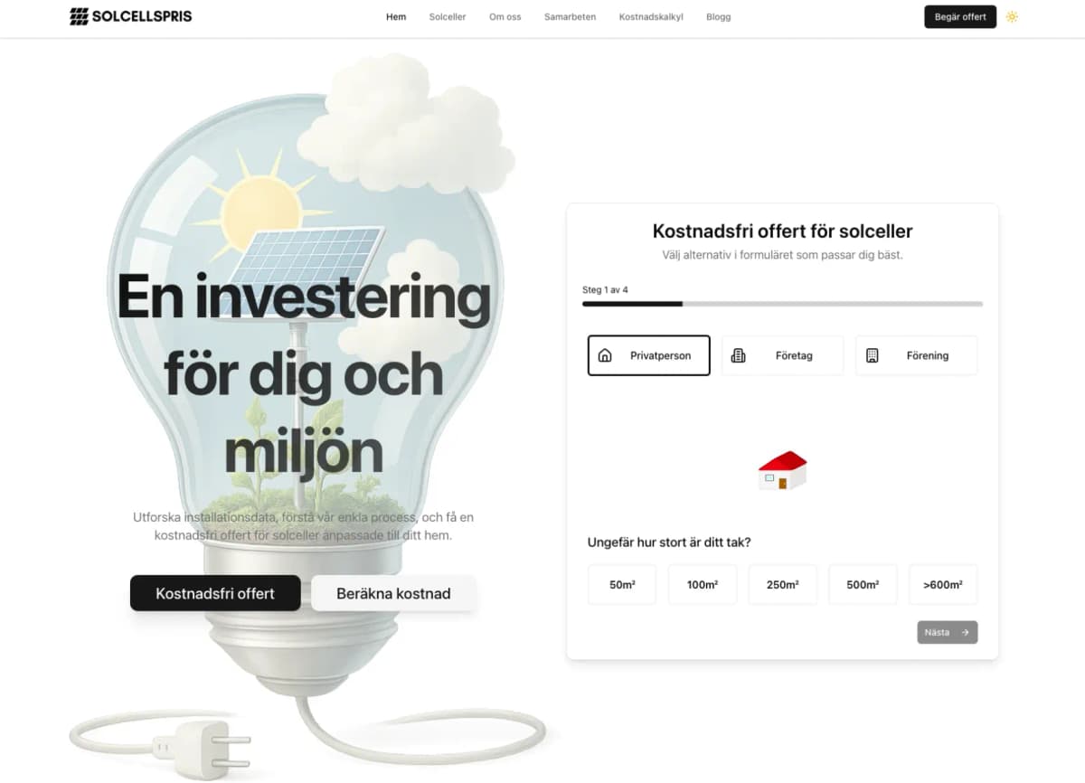 I samarbete med en kund inom energisektorn har Liminity utvecklat Solcellspris.se, en innovativ digital plattform som förenklar processen att hitta och jämföra solcellsleverantörer. Med över 100 certifierade installatörer i nätverket och kraftfulla jämförelseverktyg, effektiviserar plattformen solcellsmarknaden för svenska husägare.